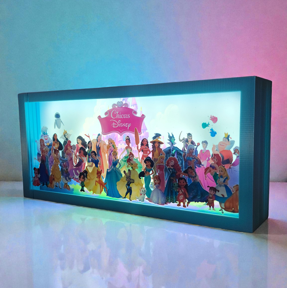 Agrega un toque de magia y encanto a tu espacio con esta Caja Lumínica de Chicas Disney. Su diseño en capas de profundidad crea un delicado efecto 3D que resalta a los personajes con elegancia, mientras la iluminación LED envuelve cada detalle con una luz suave y acogedora.