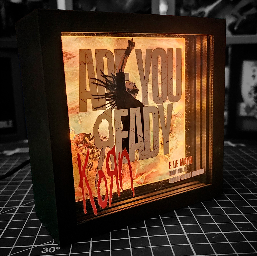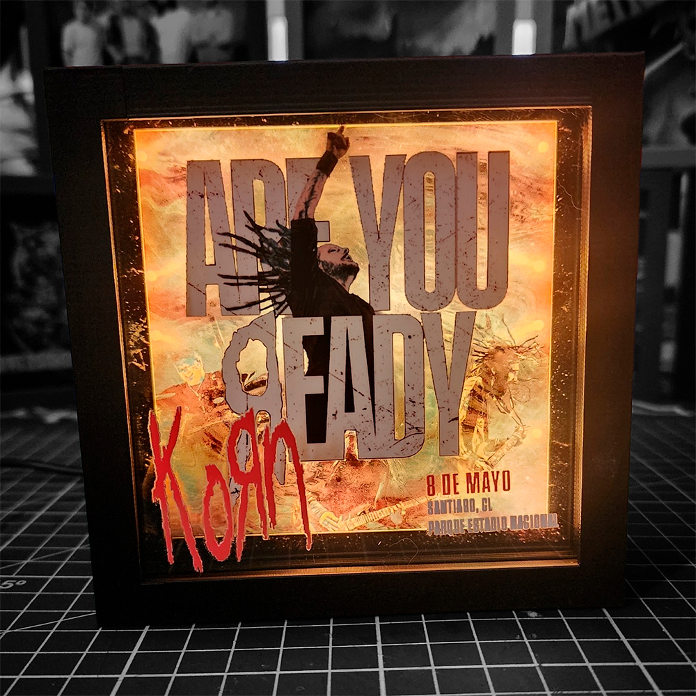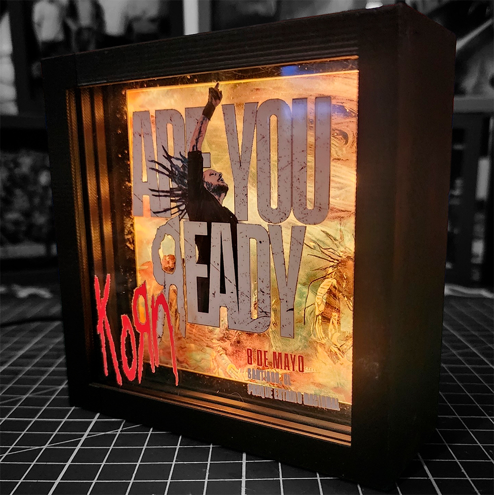 Sumérgete en la intensidad cruda del nu metal con esta caja lumínica inspirada en Korn. Su diseño en 3 niveles de profundidad crea un efecto visual profundo y envolvente, donde cada capa transmite la energía oscura y visceral que define a la banda.