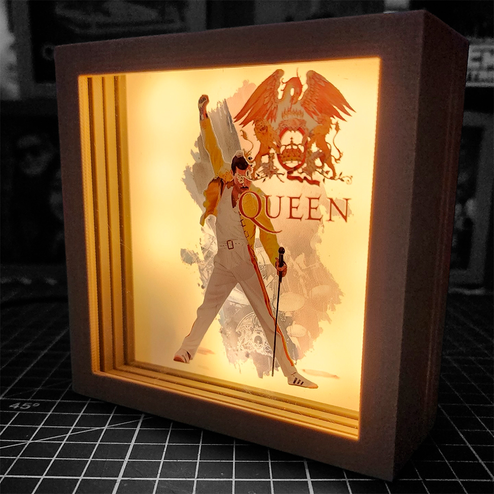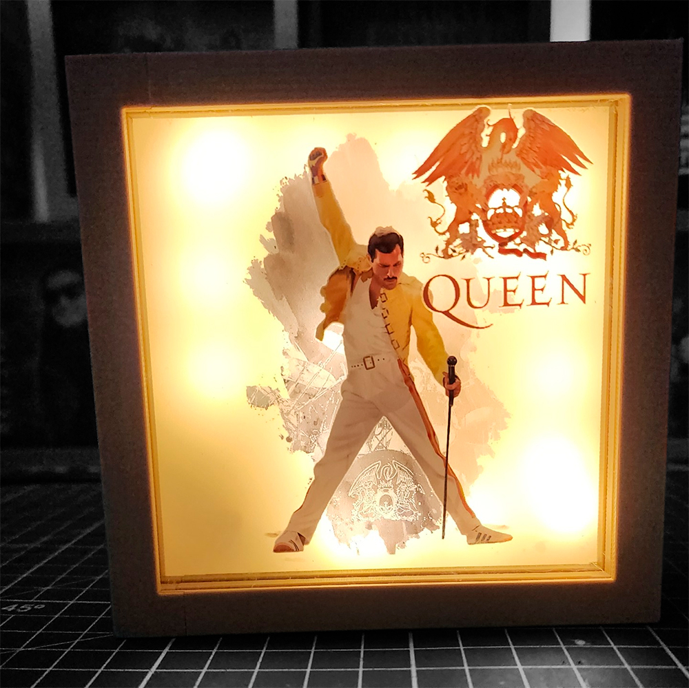Celebra la energía, el talento y la grandeza de Queen con esta caja lumínica inspirada en una de las bandas más legendarias de la historia del rock. Su diseño en 3 niveles de profundidad crea un efecto visual espectacular que da vida a los integrantes, como si estuvieran nuevamente sobre el escenario frente a miles de fans.